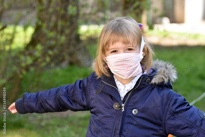 Young girl wearing a facemask for protection against coronavirus and playing outside.