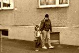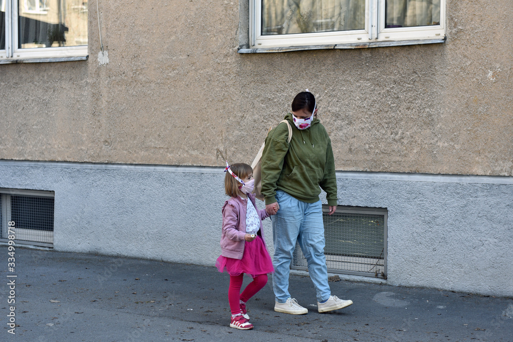 Daughter and mom wearing diy face masks for protetion against coronavirus, walking in the street.