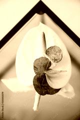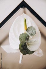 white calla flower lies on a glass table