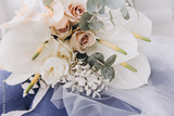 bridal wedding bouquet of white calla flowers and greenery with pink ribbon