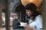 Woman using phone and hold a cup of coffee during the work and home office. Smiling businesswoman with smartphone.