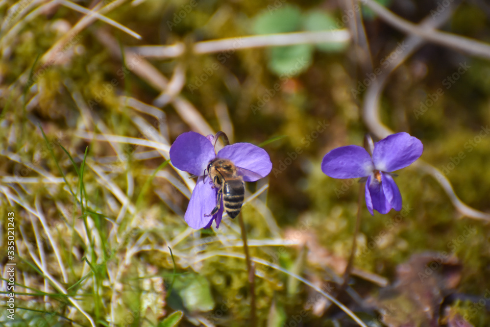 Honey bee pollinating wild Violet flower. Honey collecting nectar on wild healthy plants