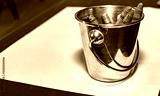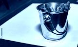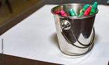 Crayons inside an aluminum bucket closeup shot white background. For school, tutor class, art school image