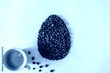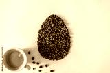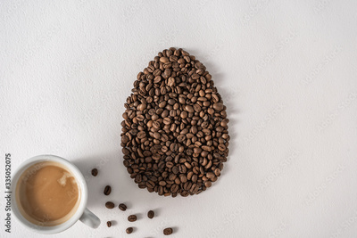 Creative flat lay composition with easter egg shape made of coffee roasted beans.Pastel colors and soft shadows. Realistic aesthetic look. Contemporary style.