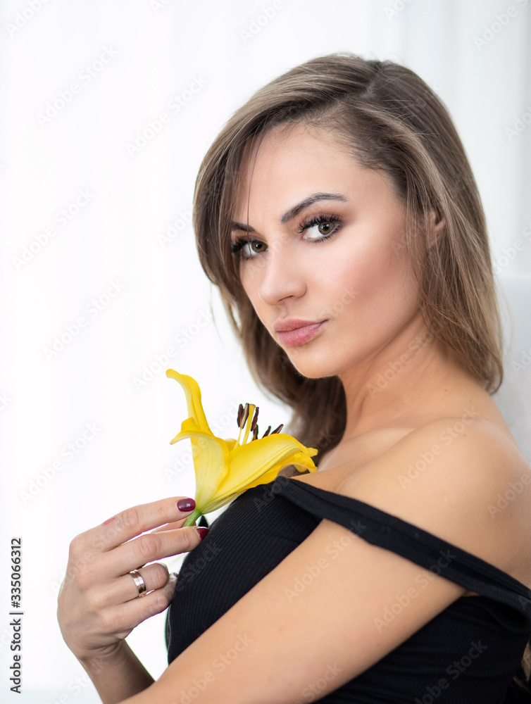 Happy, young and fit , beautiful woman with a yellow flower - daffodil. Romantic pose