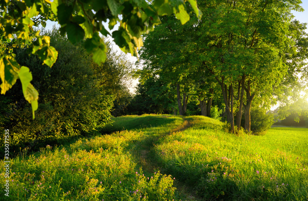 Narrow footpath leading through beautiful sunlit meadow and green trees, creating curvy lines