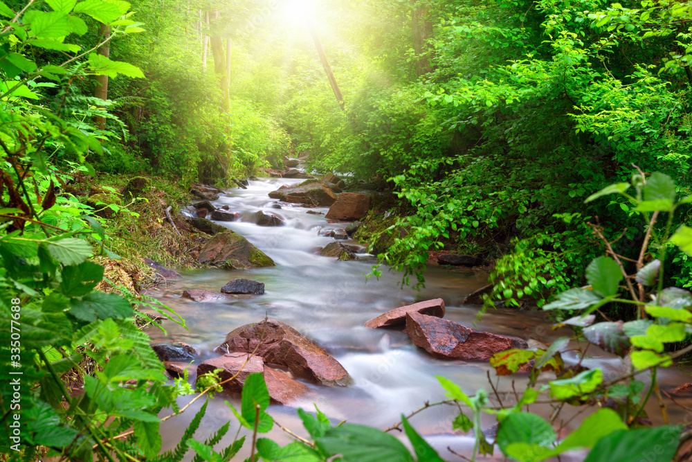 Beautiful stream flowing through a green forest, framed by vibrant foliage, with sun rays illuminating the scene from above