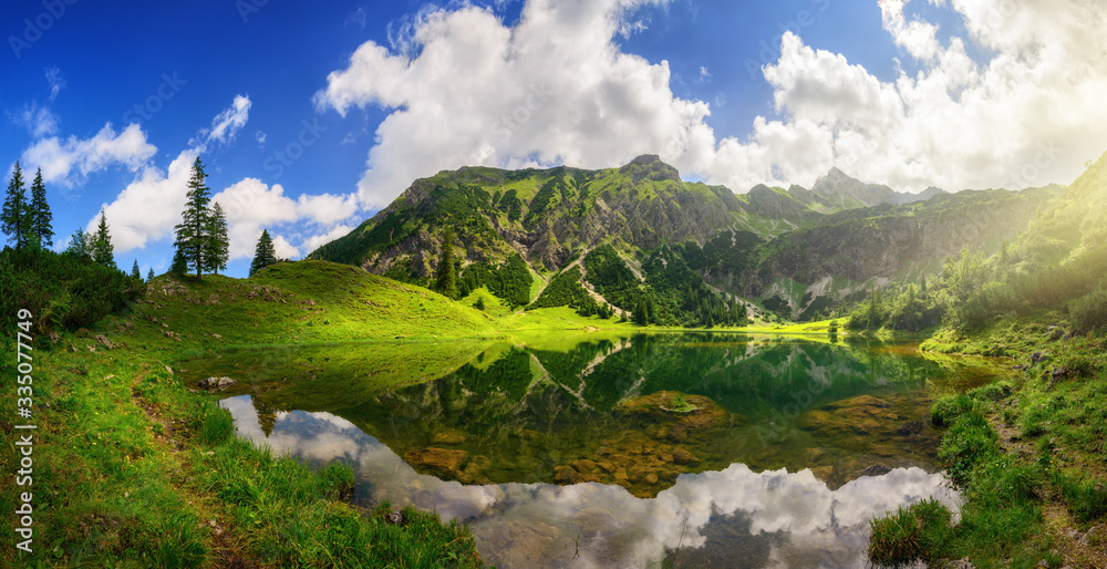 Gorgeous lake surrounded by mountains, with dramatic sunlight and the amazing scenery reflected in the clear water