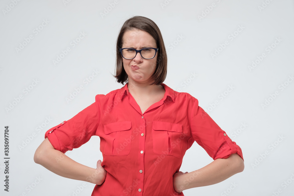 Serious young woman with disapproving expression on her face suspecting someone in lie