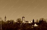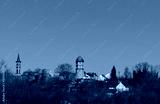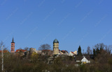 03/28/2020, detailed view of the city of Friedberg in Bavaria with parts of the historic city wall and towers against a blue sky in spring