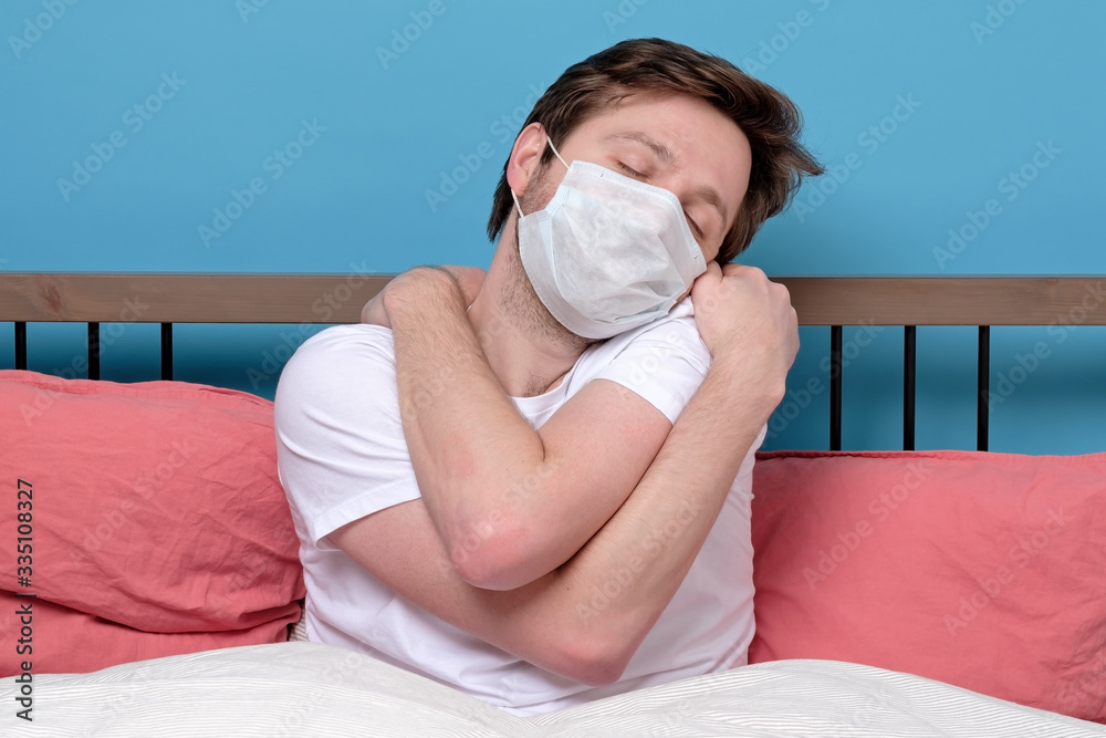 Mature caucasian man in medical mask hugging himself at bed alone.