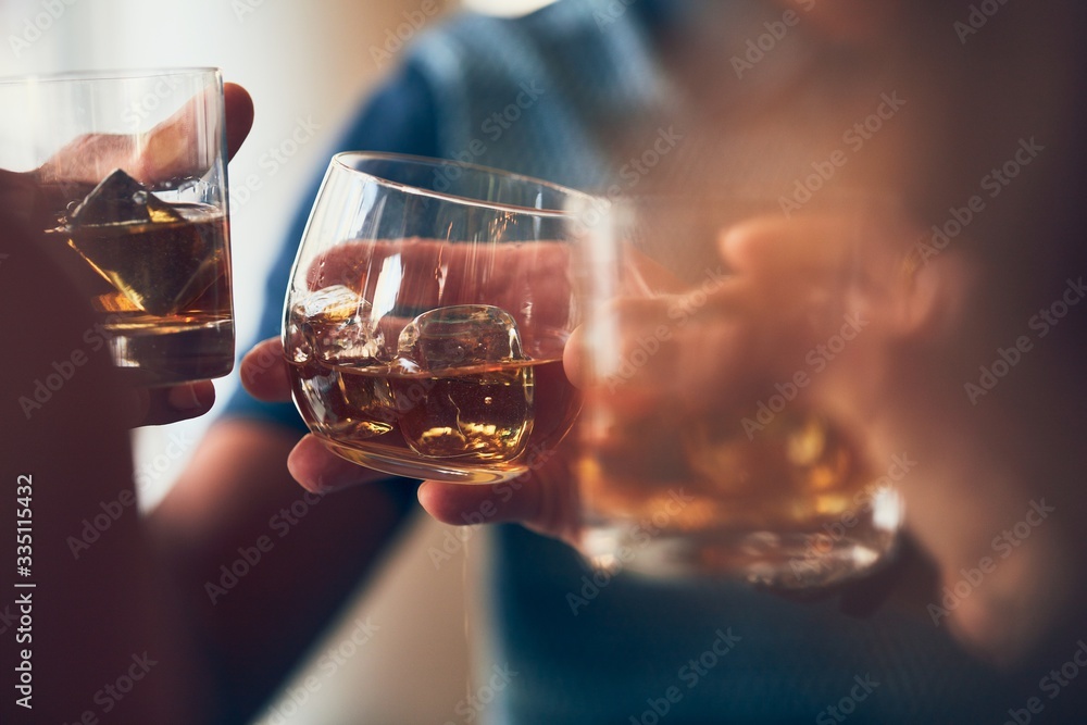 Closeup shot of many people clinking glasses with alcohol at a toast
