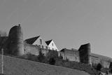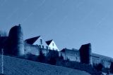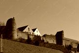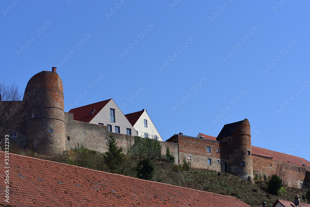 Historic city wall of Friedberg in Bavaria with towers against a blue sky and roofs that are covered with tiles