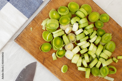Top view of sliced leak vegetables on the wooden cutting board