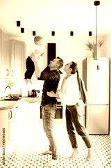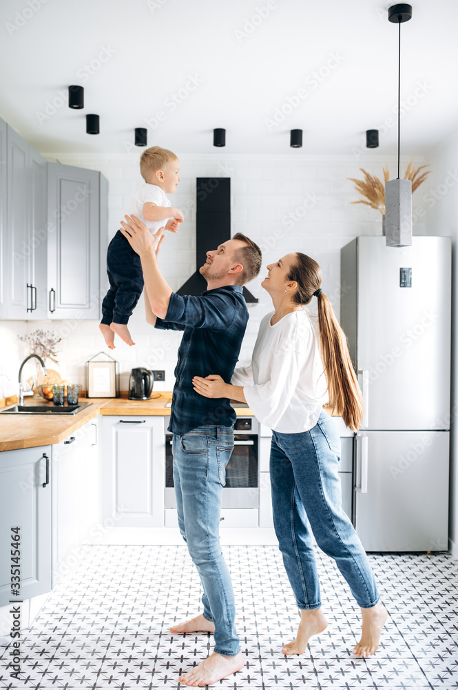 Stylish happy family is having fun at home in the kitchen. Parents play with their baby