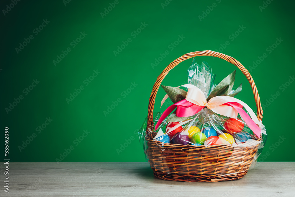 Easter gift basket with multicolor eggs, green background
