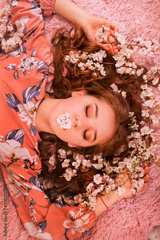 Stylish fashion photo of beautiful young woman lies among peonies. Holidays and Events. Valentine's Day. Spring blossom.