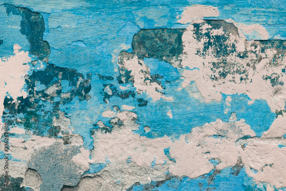 Abstract texture of old colorful blue wall with grain and scratches. Beautiful, artistic, creative background. White, grey and blue rough weathered stone texture. Copy space
