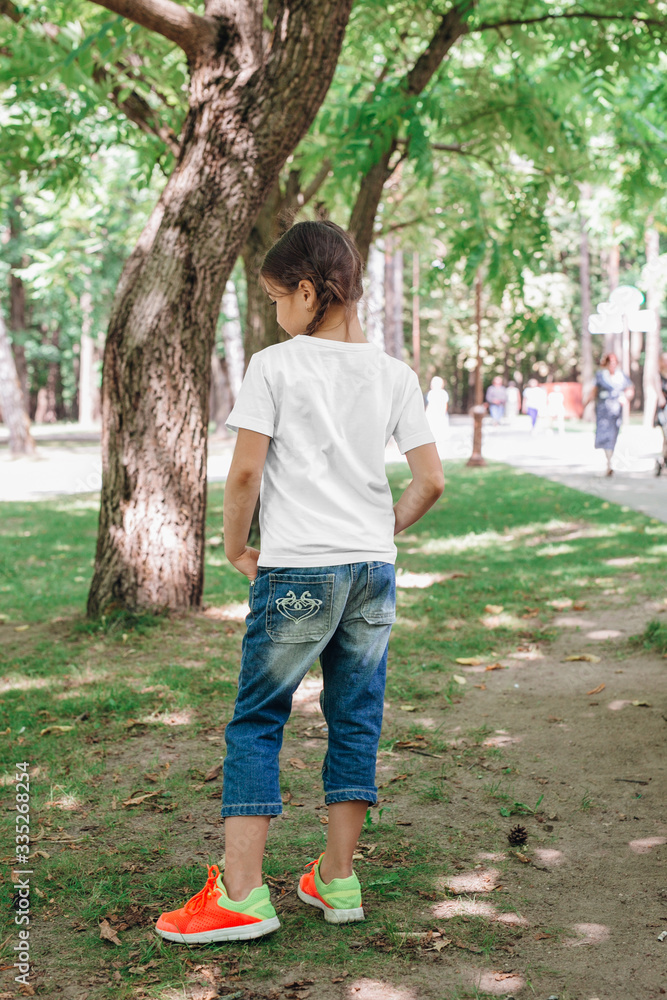 back views of little girl in blank t-shirt walking in park. Mockup for design