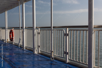 Gate and ring life preserver on a ferry ship exterior walkway, horizontal aspect