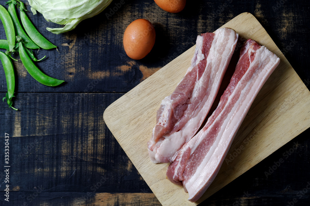 Raw Pork Belly sliced on cutting board dark background