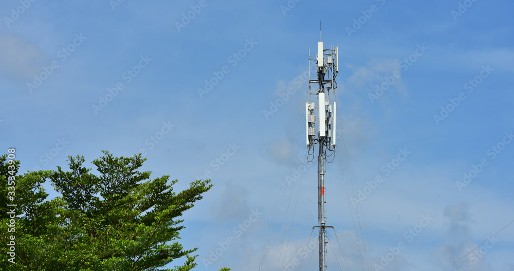 .Wireless Communication Antenna With bright sky.Telecommunication tower with antennas.High pole for signal transmission. There are both wireless phone systems and microwave systems.