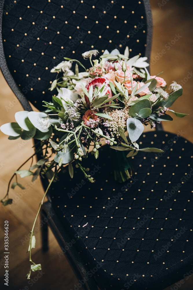 wedding bouquet of flowers and greenery with a ribbon stands on a chair