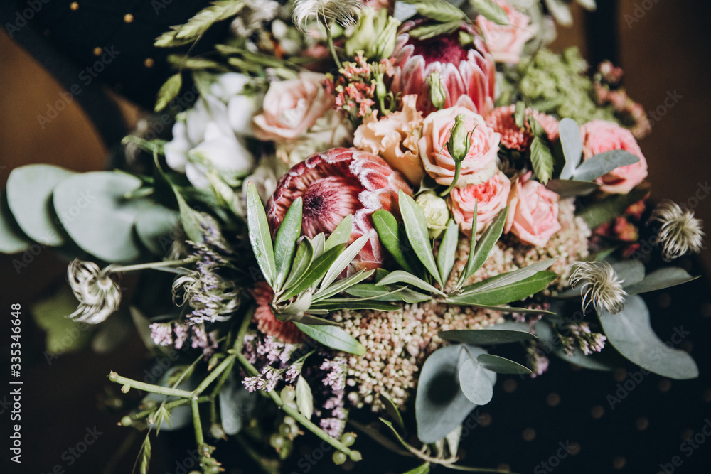 wedding bouquet of flowers and greenery with a ribbon stands on a chair