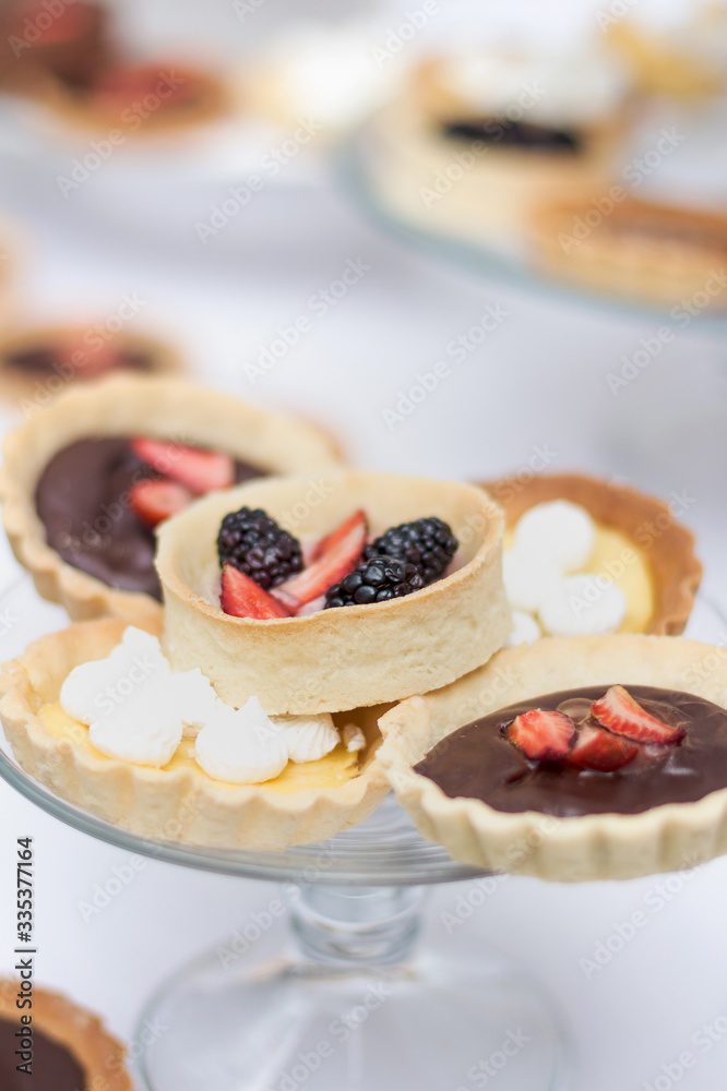 tartaletas y pasteles de frutas en mesa blanca