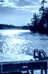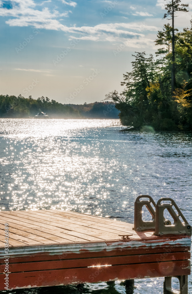 Autumn foliage, edge of the dock with sun glistening, sparkling, golden warmth