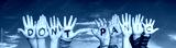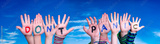 Kids Hands Holding Colorful English Word Do Not Panic. Blue Sky As Background