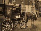 Scene in Dam Square in Amsterdam. Horses with a classic carriage and coachman as a traditional transport. Toned photo, antique style.