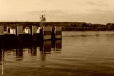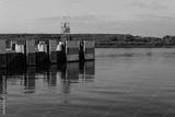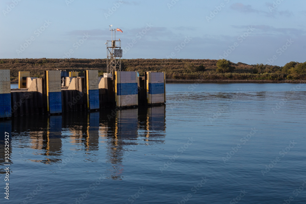 Padded concrete pier in a ferry landing waterway, boat dock, horizontal aspect
