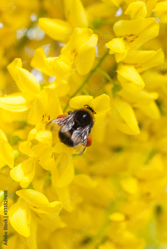 Bumble bee sitting among yellow flowers. Full pollen baskets. Corbicula. Laburnum, golden chain, golden rain.