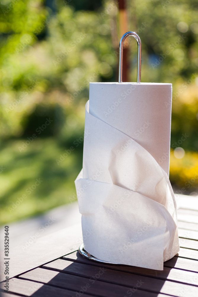 Paper towel roll on garden table in sunshine. Green blurred background. Outdoor kitchen.