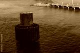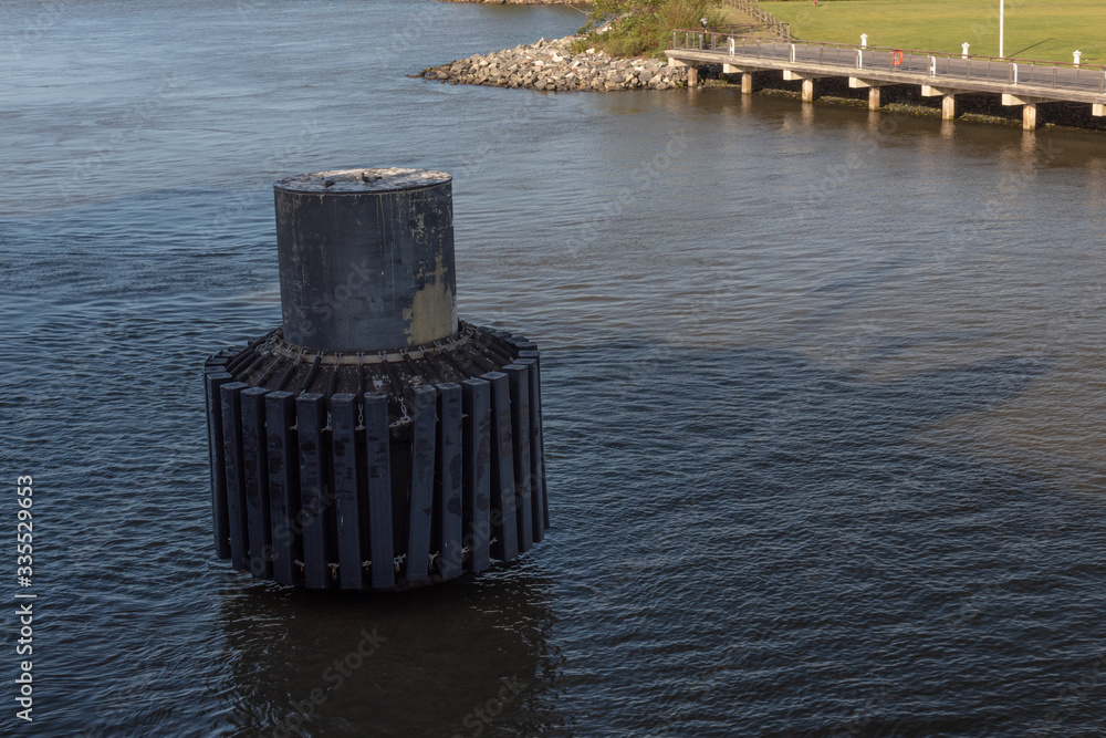View looking down on a modern dolphin pier piling in the shadow of a ship, horizontal aspect