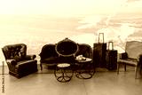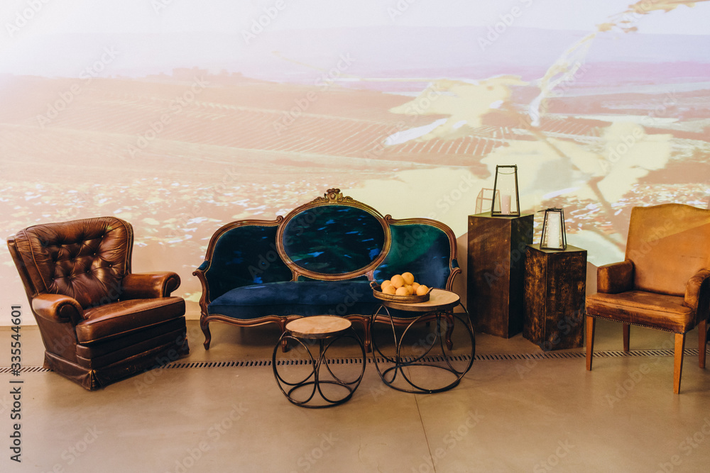 Recreation area with upholstered furniture. Sofas, armchairs and chairs, on the coffee tables are fresh fruit