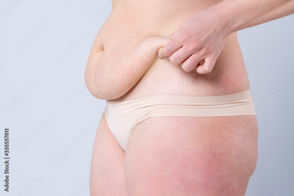 Tummy tuck, flabby skin on a fat belly, plastic surgery concept