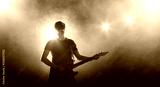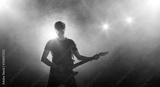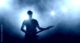 Young male singer performing on a stage and playing the guitar. Smoky blue background