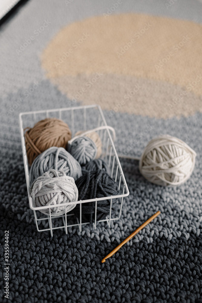 Knitted carpet or rug. Antique handmade carpet. Home hobby.