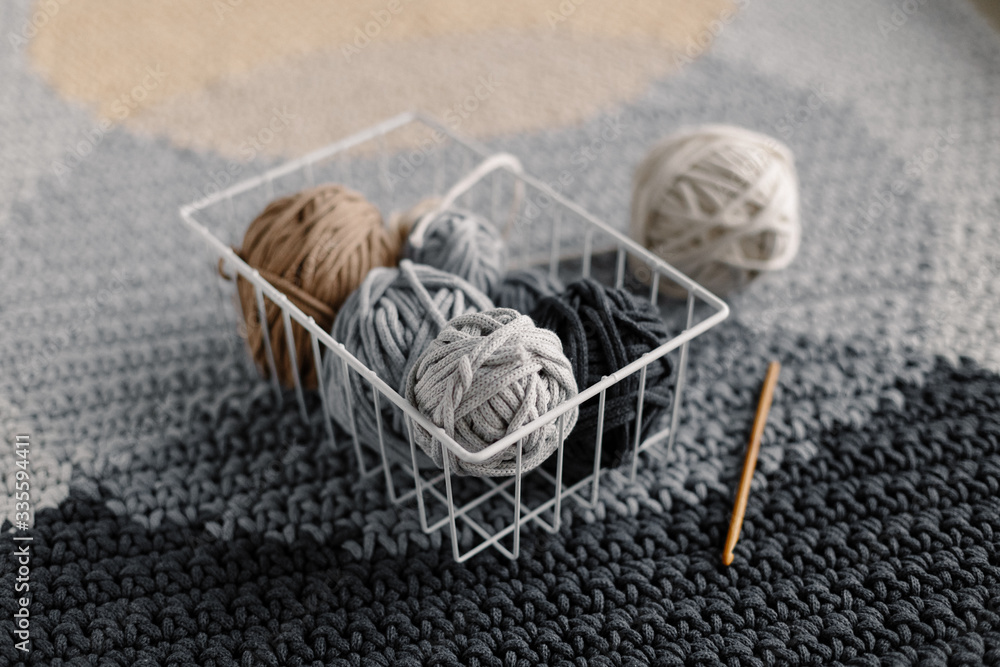 Knitted carpet or rug. Antique handmade carpet. Home hobby.