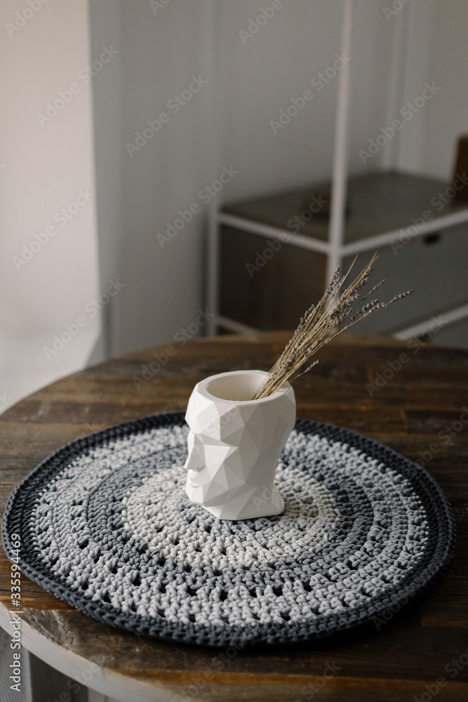 Knitted carpet or rug. Antique handmade carpet. Home hobby.