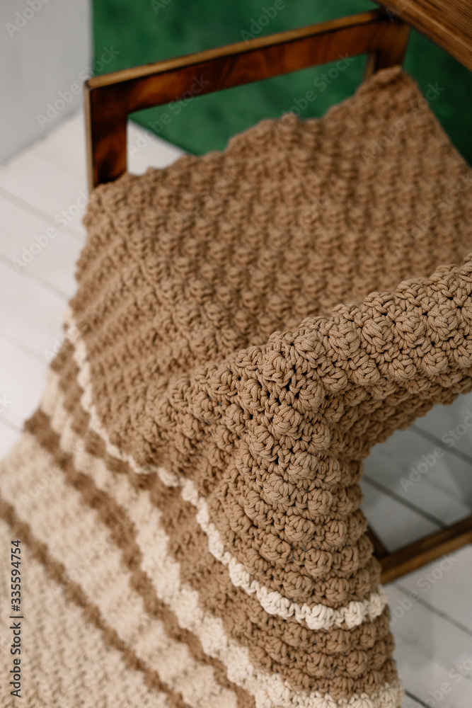 Knitted carpet or rug. Antique handmade carpet. Home hobby.