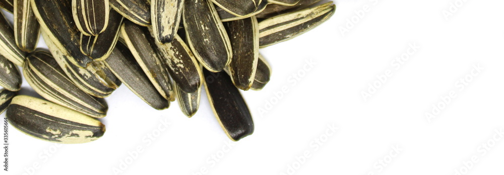 Organic sunflower seed. Sunflower crack seeds isolated on the white background. Close up. Banner.