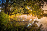 Konary drzewa zwisające nad starym korytem Warty na Łegach Rogalińskich. Unosząca się mgiełka i odbicia w wodzie sprawiają tajemniczy nastrój.