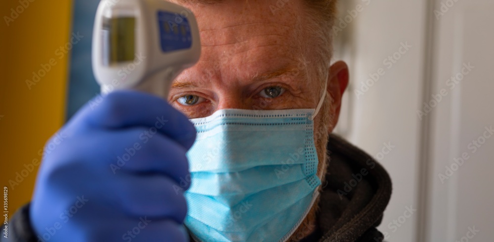 Man in a face mask and gloves checking body temperature with infrared forehead thermometer.