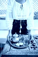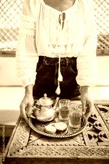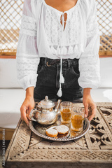 Woman hands holding silver tray with traditional moroccan mint tea, cookies and vintage teapot. Hospitality and service in Morocco.