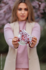 Pretty woman is wearing protection face mask decorated with pink flowers, virus and spring concept.