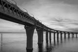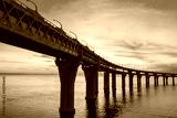 The highway over the water. The road against the sunset. Road bridge over the water on the background of sunset. The Expressway passes over the bridge. The bridge in the background of the morning sky.