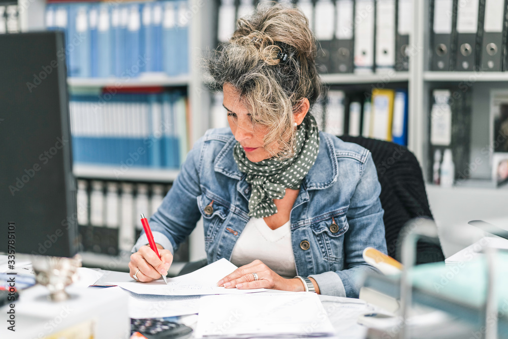 Mujer escribiendo en un papel en una oficina con archivadores de fondo.